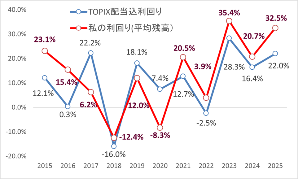 2025年の日本株市場が終わり、運用利回りがベンチマークであるTOPIXを上回れました。今年の運用を振り返ります。