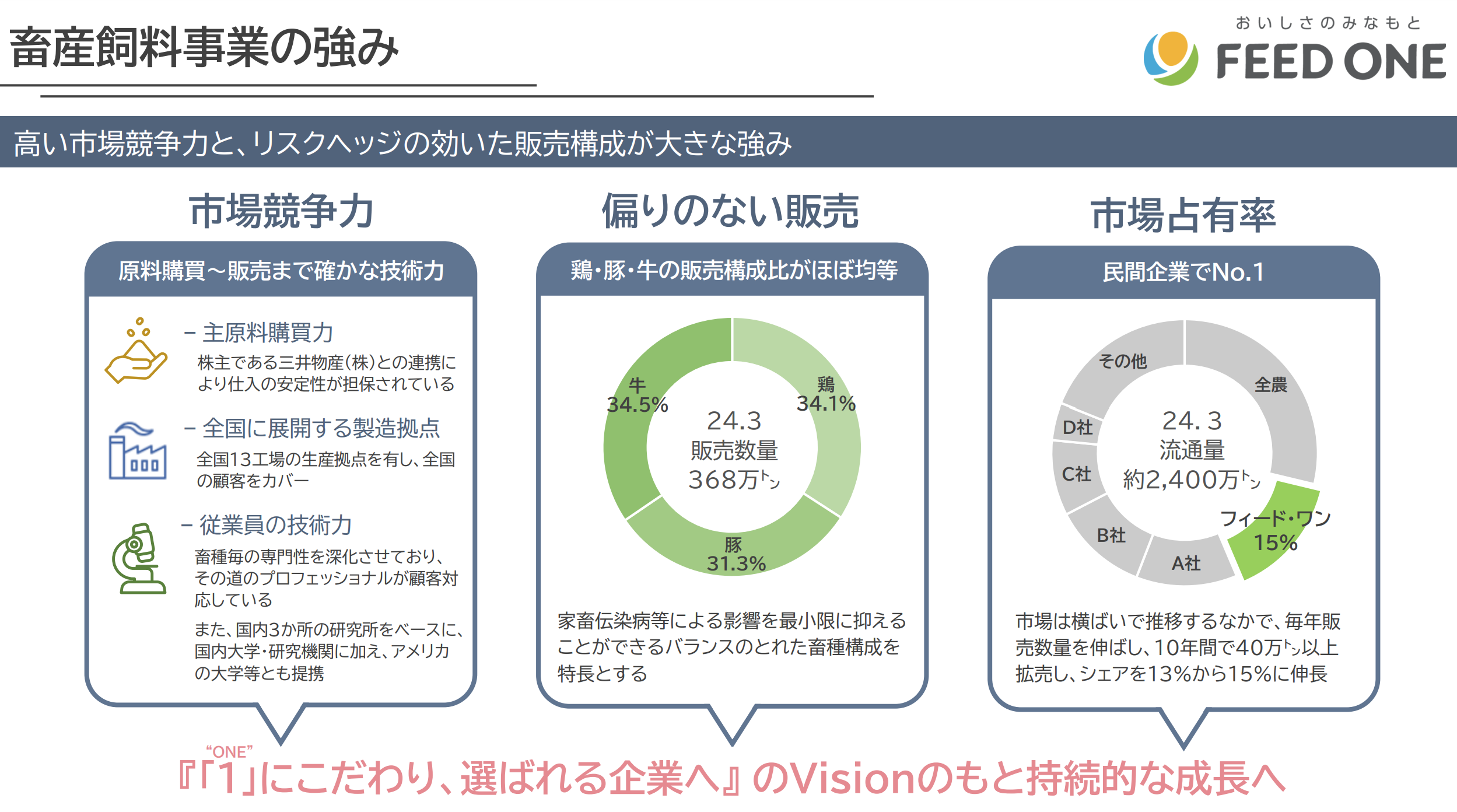 フィード・ワンの市場占有率は全農に次ぐ第2位で、15%のシェアを持っています。畜水産飼料は、フィード・ワン、中部飼料、日本農産工業、片倉コープアグリが競合となります。飼料は製造工場や倉庫などの設備投資も必要であり、参入障壁が高く、競争環境は厳しくなさそうです。