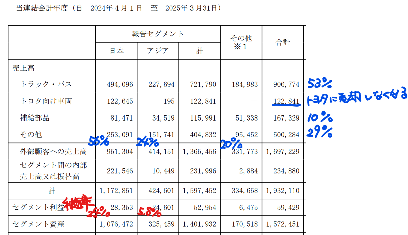 なお、日野自動車はトヨタのハイラックスやランドクルーザーなど乗用車・小型トラックの受託生産を行っており、トヨタ受託生産の売上高は9%程度ありました。しかし、2025年6月に受託生産を行っていた日野自動車羽村工場は、トヨタへの移管が決まりました。日野自動車は商用車に集中することになります。
