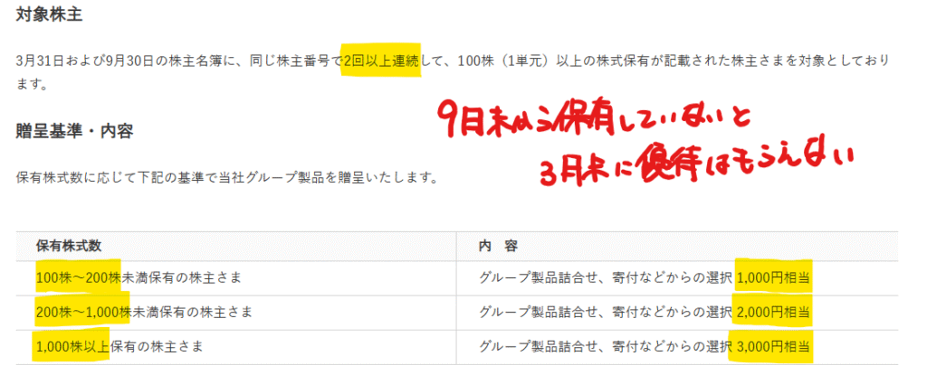 持株数に応じて株主優待がもらえるのは魅力的です。9月末から保有していないと3月末の優待はもらえないので、今購入しても3月に優待がもらえないのは残念です。