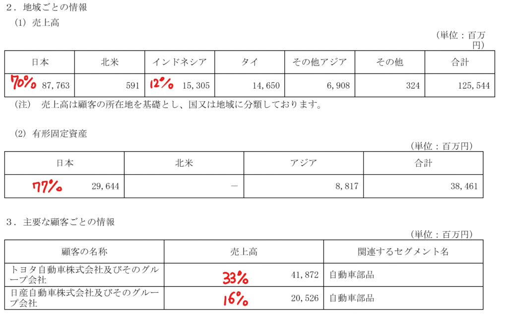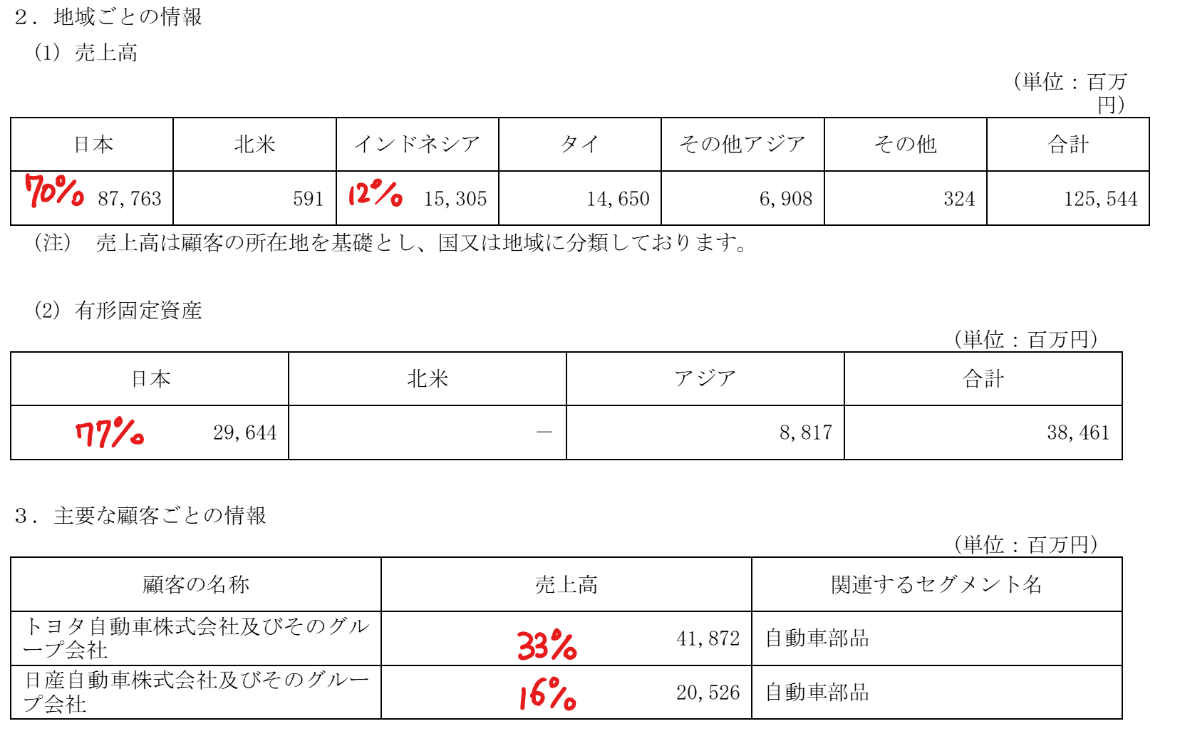 海外売上比率が3割程度で製造拠点も国内中心です。トヨタ・日産向けが売上の5割を占めています。