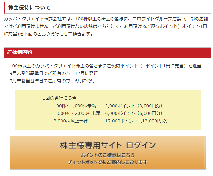 コロワイドグループのアトムは、業績低迷に伴い株主優待を改悪しました。カッパの株価は優待により高値に釣り上がっていると思います。カッパの業績が低迷しており、親会社のコロワイドから優待改悪を命じられようものなら、アトムと同様に一気に株価が下落すると思います。