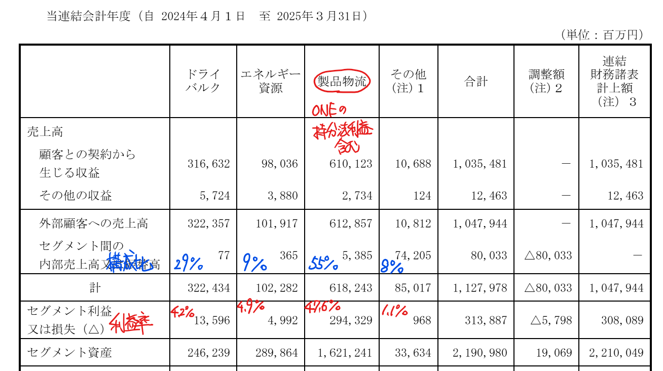 海運大手3社のコンテナ事業は2017年にONEに統合されました。それぞれ3割ずつ出資しており、営業外収益の持分法による投資損益として3社に取り込まれます。