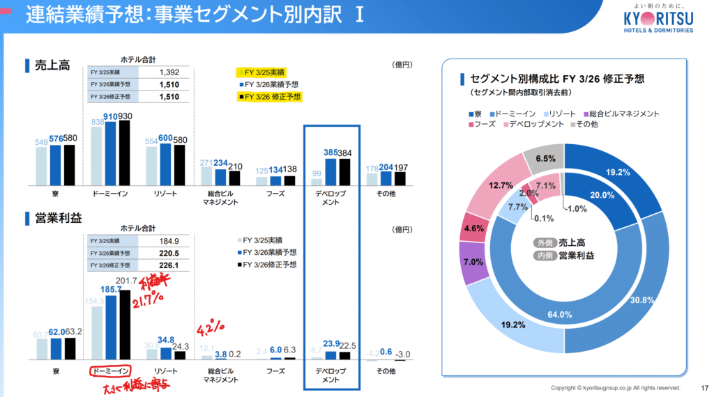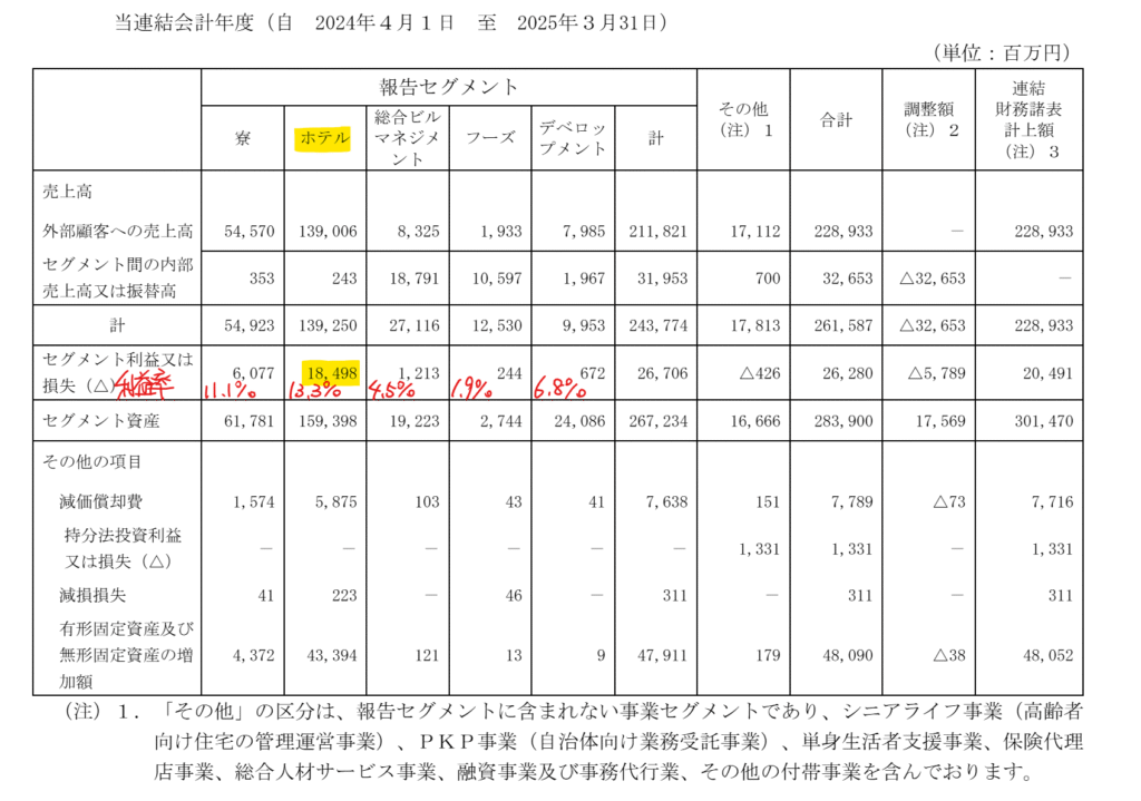 ホテル事業の利益率が高く、ドーミーイン(ビジネスホテル)の利益が業績に大きく寄与しています。