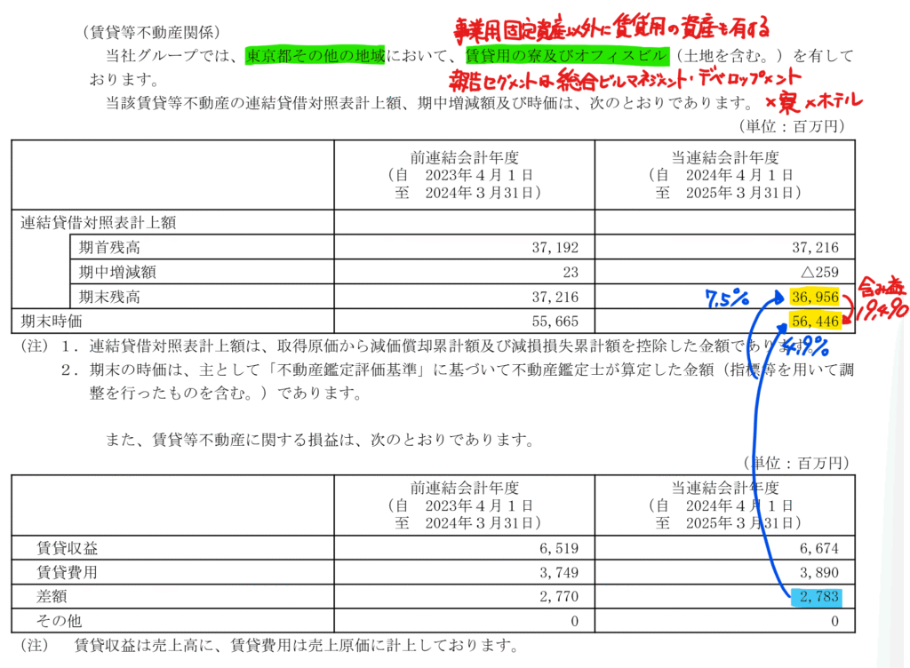 さらに、ドミール賃貸を含めると、寮事業の中には実質的に賃貸不動産業に近い資産も内包されています。公表されている賃貸等不動産の含み益は約200億円ですが、寮・ホテルとして使われている不動産に内包された含み益は、B/Sに現れていません。
