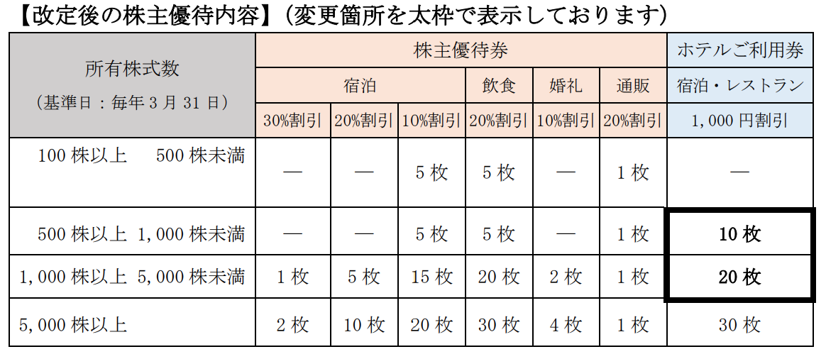 持株数に応じて、割引券やホテル利用券がもらえます。お得ではありますが、元の値段が高額なので、お得感は少ないです。本日1,000円割引券の枚数を増やすというプレスリリースがありました。