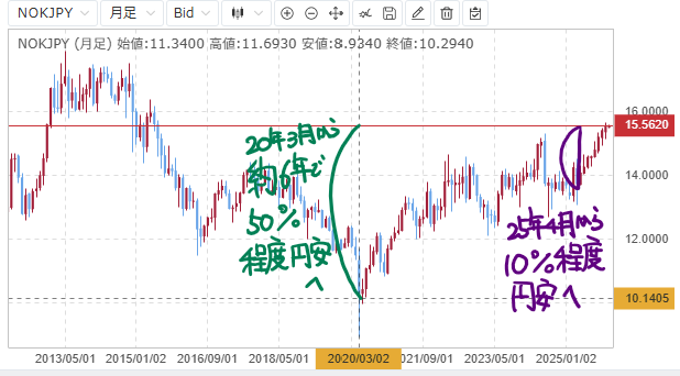 為替面では円安が進行しており、足元では1ノルウェークローネ=約15.6円と、2020年比で約50%の円安水準です。さらに2025年4月から10%程度円安になっています。