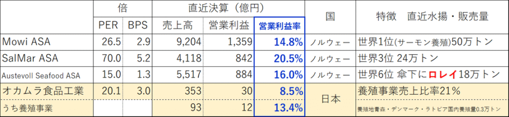 オカムラ食品工業のPBRは約3倍と、日本の水産大手であるマルハニチロやニッスイと比べると割高です。しかし、世界最大手のノルウェー企業Mowiと同水準であり、成長企業としての評価と捉えることもできます。同社は養殖事業を年率2割で拡大する計画ですが、仮に現在の3倍の規模に増産しても、最大手のMowi全体の3%程度に過ぎません。北欧と比較した地理的優位性とアジアの旺盛な需要を考慮すれば、増産は十分吸収可能と考えています。