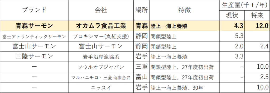 日本ではサーモン養殖ブームが続いており、陸上養殖を含め参入企業が増えています。現状では、丸紅支援の富士アトランティックサーモンが最大規模で、青森サーモンは2番手といった位置づけです。