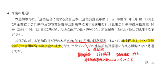 資本剰余金293億円 子会社株式293億円となり、株主資本を減額する効果があります。(非支配株主持分をパーク24は有しているのでしょうか?BSで見つけられませんでした。)