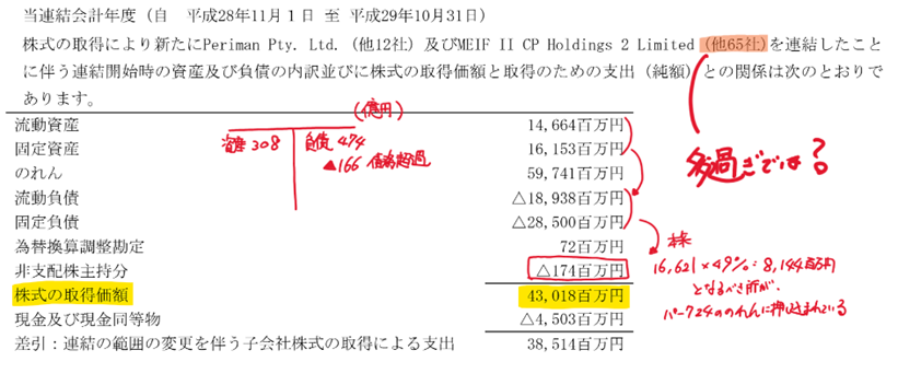 2017年のイギリス事業の買収開示を見ると、違和感があります。英国の会社は166億円の債務超過の会社であり、非支配株主持分は166億円×49%=81億円の資産側に計上されるべきです。しかし、実際には純資産のマイナス1億7千万円となっています。