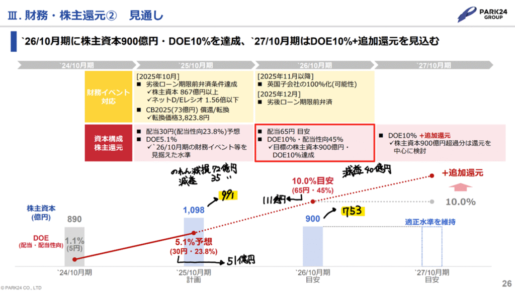 中期経営計画(2025年12月公表)の財務・株主還元②見通しが分かりやすいです。パーク24は適切な株主資本の水準を900億円に設定しており、剰余資金を株主還元に充てるとしています。