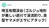 埼玉有間渓谷(ゴルジュ地形が美しい逆川で渓流釣り、良型ヤマメがエサにアタック)|ひかこ