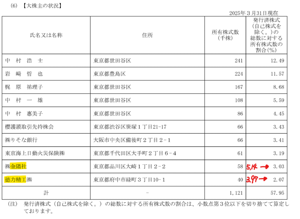 金陽社と徳力精工の2社の保有比率が変化していました。社長の中村以下ファミリーと予想される株主の増減はありませんでした。経営陣が株を手放したくないという強い意志を感じました。