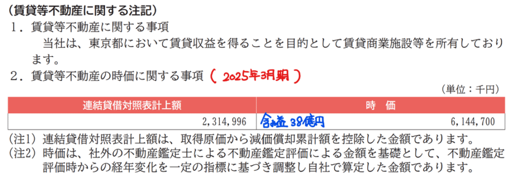 しかし、私は路線価をもとに実勢価格の時価に割り直すことで求められる時価により、100億円程度の含み益があると見ています。