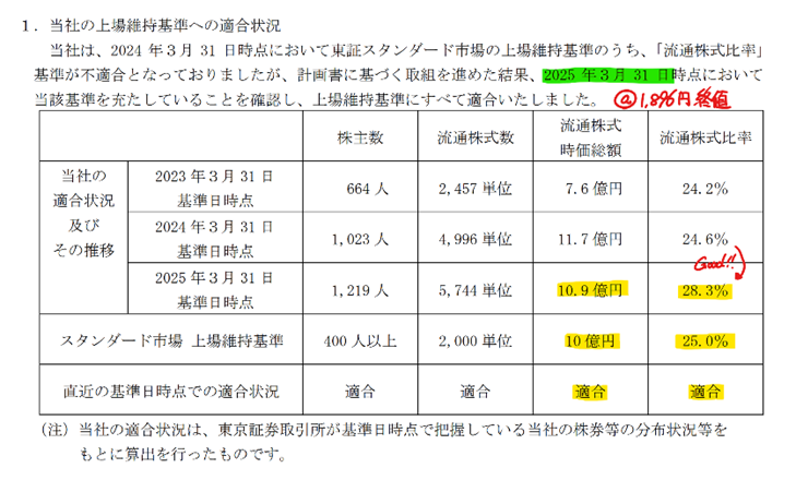 2024年6月までは流通株式比率が不適合でしたが、安定株主に市場での放出を要請し、適合になりました。2025年3月31日の終値は1,896円であり、流通株式時価総額10億円を満たす株価は1,739円だと分かります。不適合までギリギリのラインでした