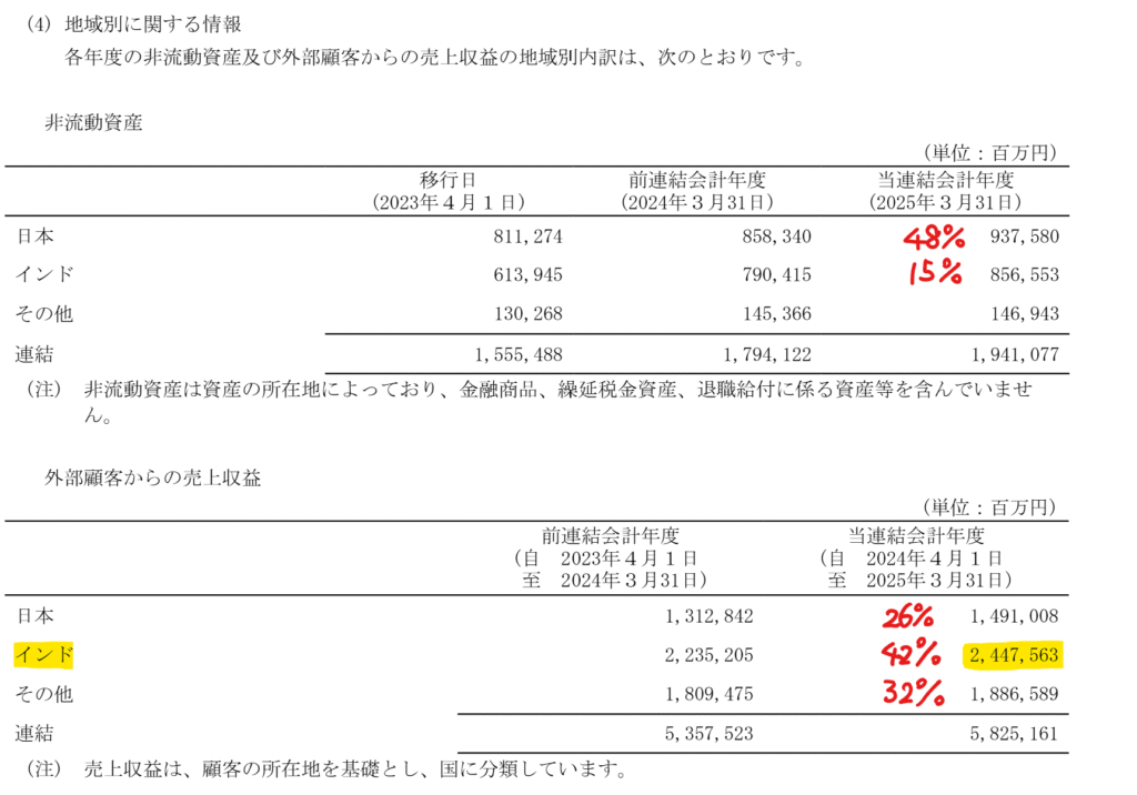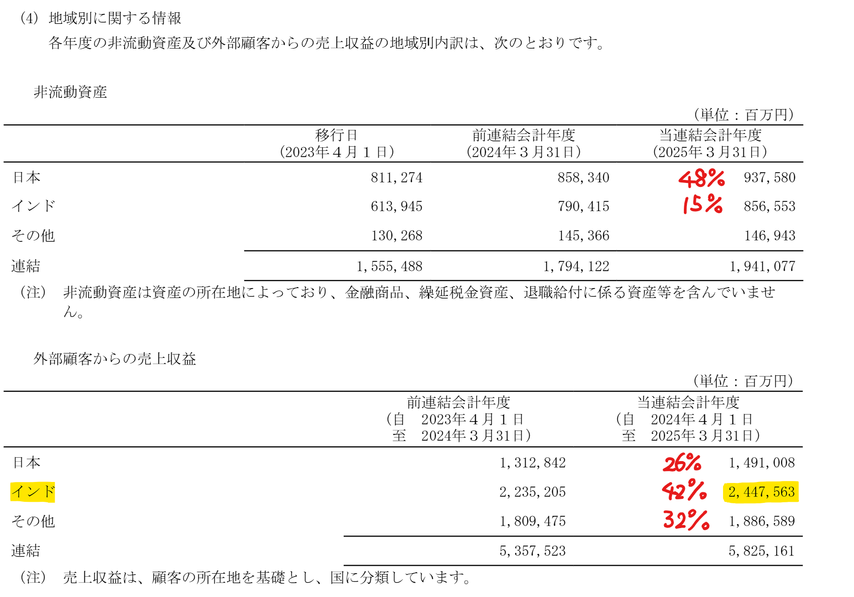 四輪自動車の売上規模が大きく、インドにおける売上比率が高いです。