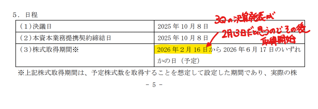 2026年2月16日を株式取得開始日と計画しており、TREの決算発表予定日の傾向から3Q決算発表の翌営業日に設定されています。