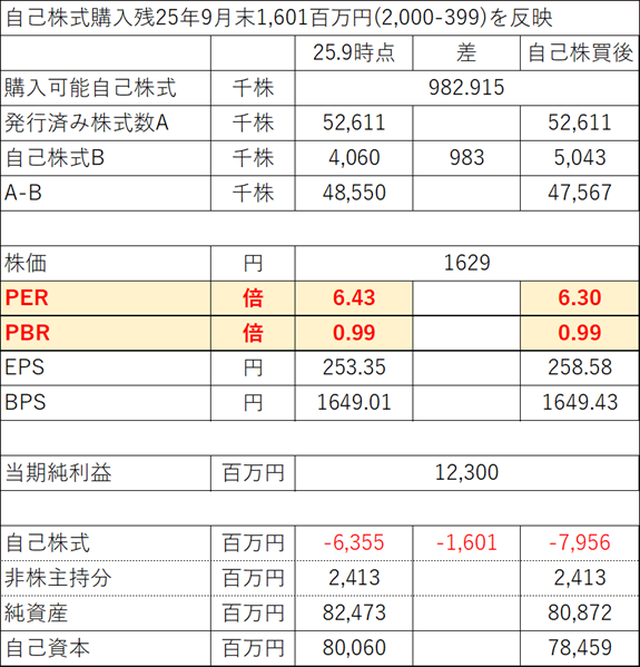 ところで、現時点(25.9末)の財務・業績状況ですべての自己株買いが完了したと仮定すると。