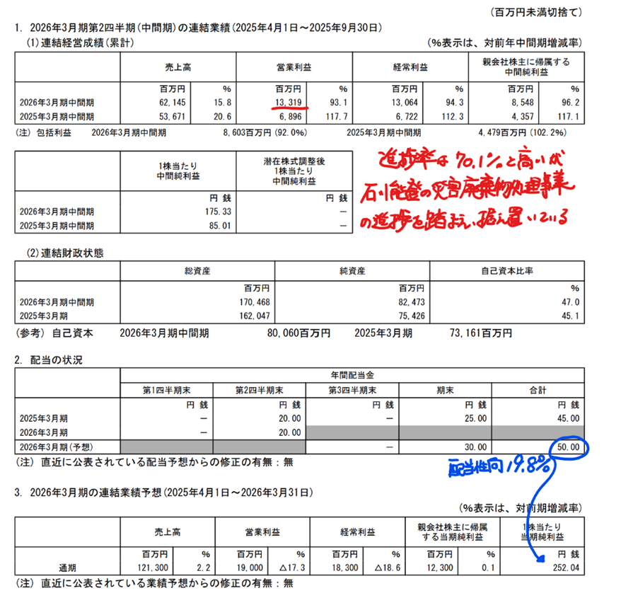 上期業績の営業利益は予想(8/8)に対して22億円の大幅増益となっています。通期予想に対する進捗率も70%と高いのです。決算説明資料を見ると、石川能登の「災害廃棄物処理事業の進捗を踏まえて据え置き」とありました。以前の中期計画に27年3月期までの取特需があると書いてあったので、少し早まったのかもしれません。