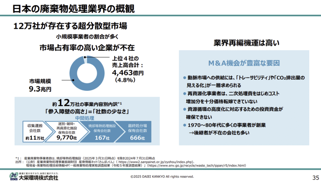 日本は人口減少により内需の縮小が見込まれます。しかし、廃棄物処理業界は、TREホールディングスや大栄環境など上位4社の市場占有率が5%程度であり、小規模事業者の割合が多いです。TREも大栄環境など大手企業はM&Aを進めており、規模拡大を図っています。小規模事業者の後継者不足もあり、事業の拡大余地がありそうです。